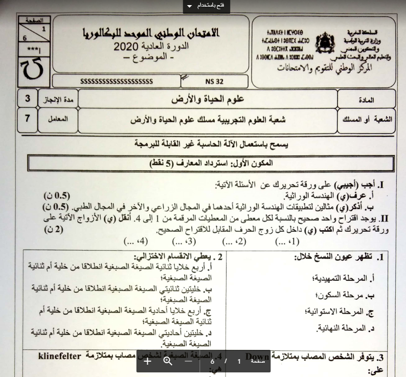 إمتحان مادة علوم الحياة والأرض 2020 الدورة العادية